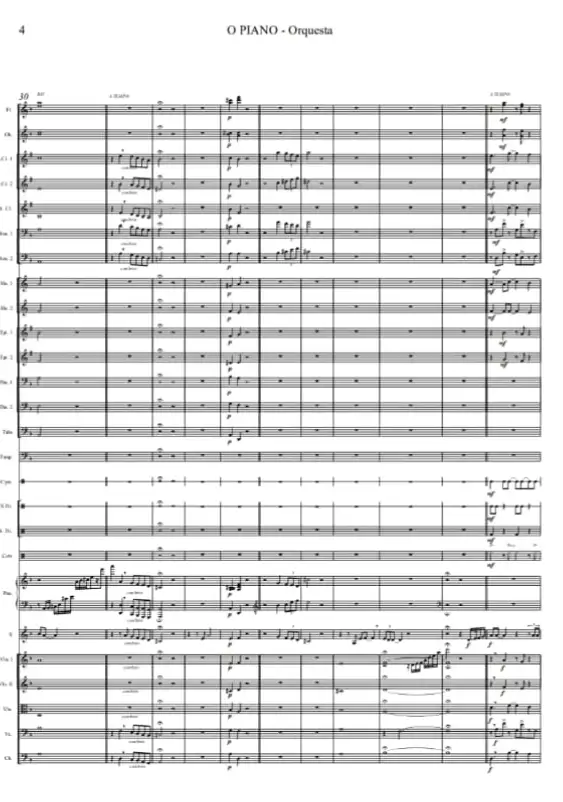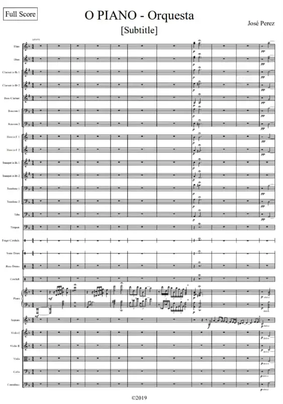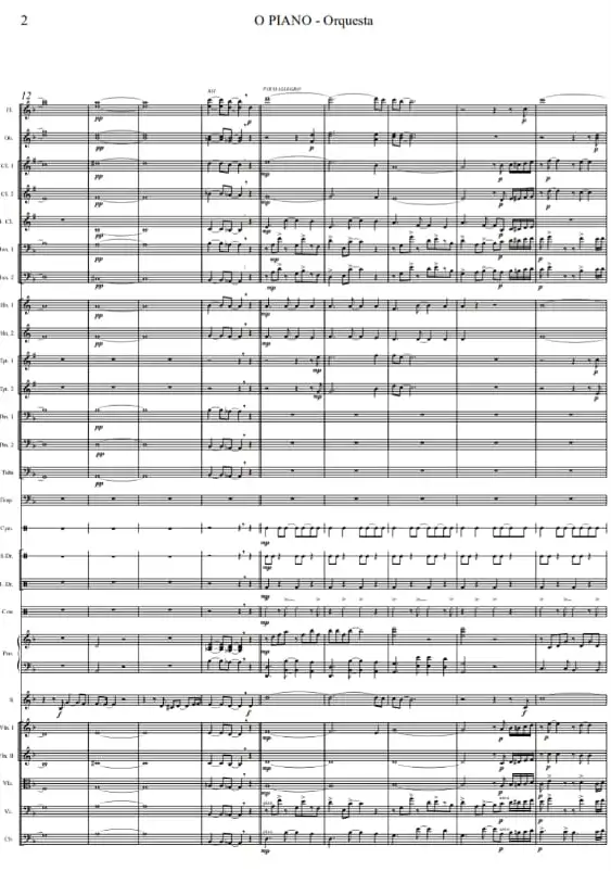 Orquestación completa: cuerdas, vientos, maderas, metales y percusión con riqueza tímbrica.